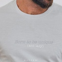 Mi camiseta tiene la frase “Born to be unique (and lazy)” Mi pantalón tiene un estampado de cuadros que contrasta con la cinta del pantalón.