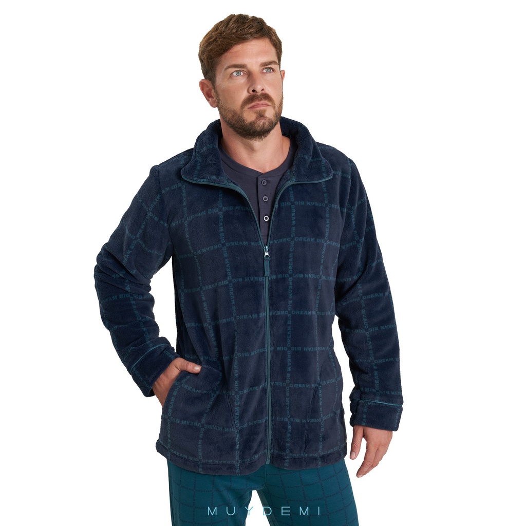 Tengo un estilo de bata con forma de chaqueta que puedes usar para exterior. Mi tejido es muy cálido y suave. Tengo bolsillos laterales y cremallera. Mi color es azul y tengo un estampado que pone DREAM BIG, que forma cuadros.